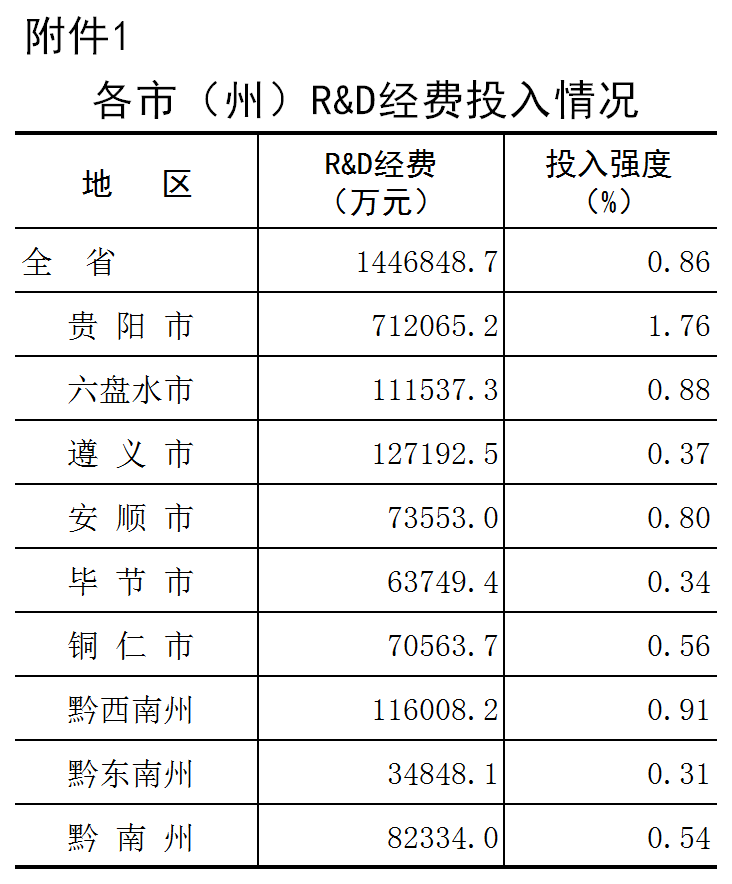 按投入地区分,全省九个市(州),R&D经费投入超过十亿元的市(州)有4个,分别为贵阳市、遵义市、黔西南州和六盘水市;投入强度高于全省平均水平的市(州)有3个,分别为贵阳市、黔西南州和六盘水市(详见附件1)。