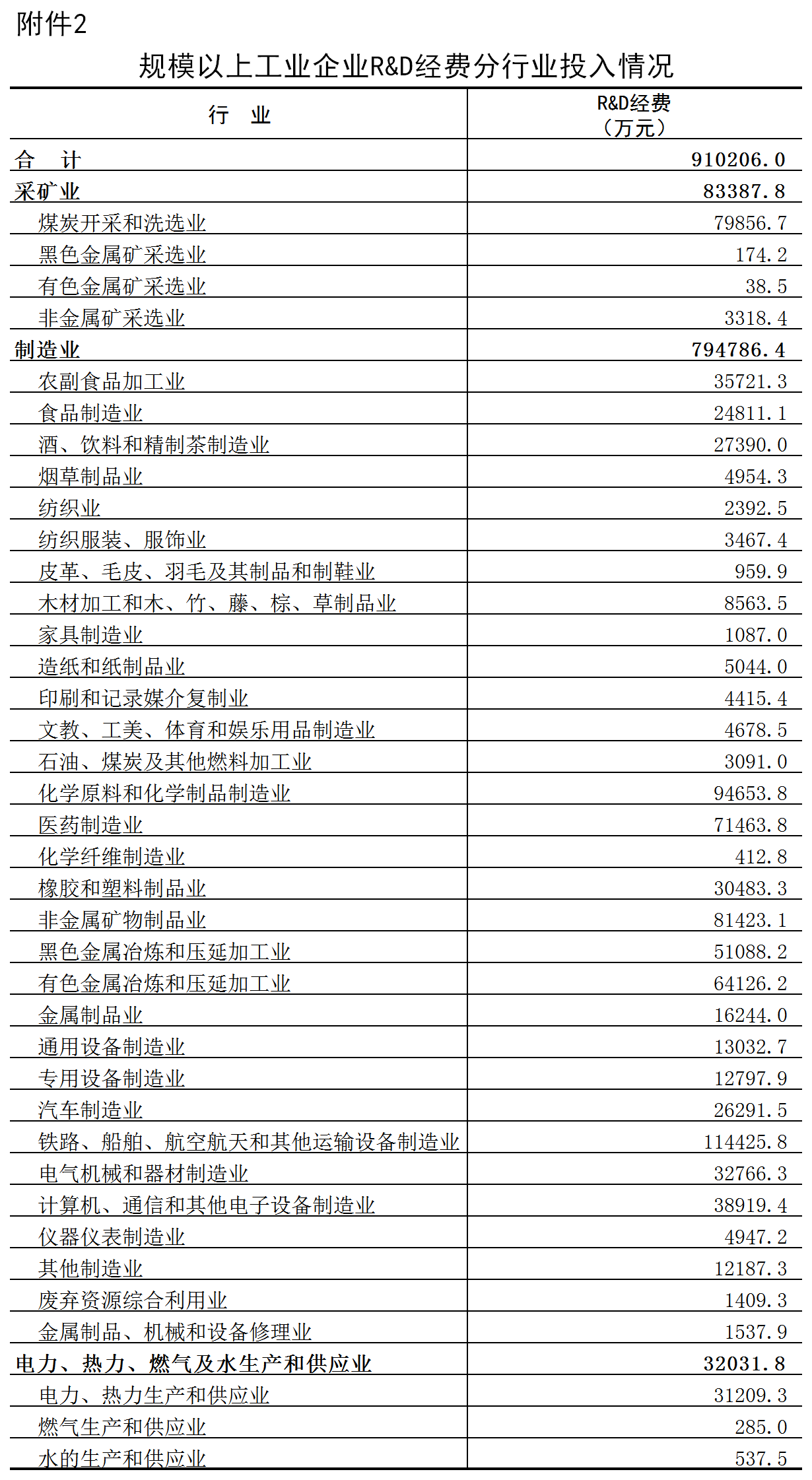 规模以上工业企业研究与试验发展(R&D)经费的统计范围为年营业收入在2000万元及以上的采矿业,制造业,电力、热力、燃气及水生产和供应业企业。