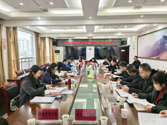 调研组与铜仁市及碧江区纪检监察、组织人事、发展改革、工信、商务、司法、统计等相关部门和部分统计调查对象代表召开调研座谈会,听取参会单位和人员对《贵州省统计条例(征求意见稿)》的意见建议,并就统计工作中的难点和立法需求进行研讨。
